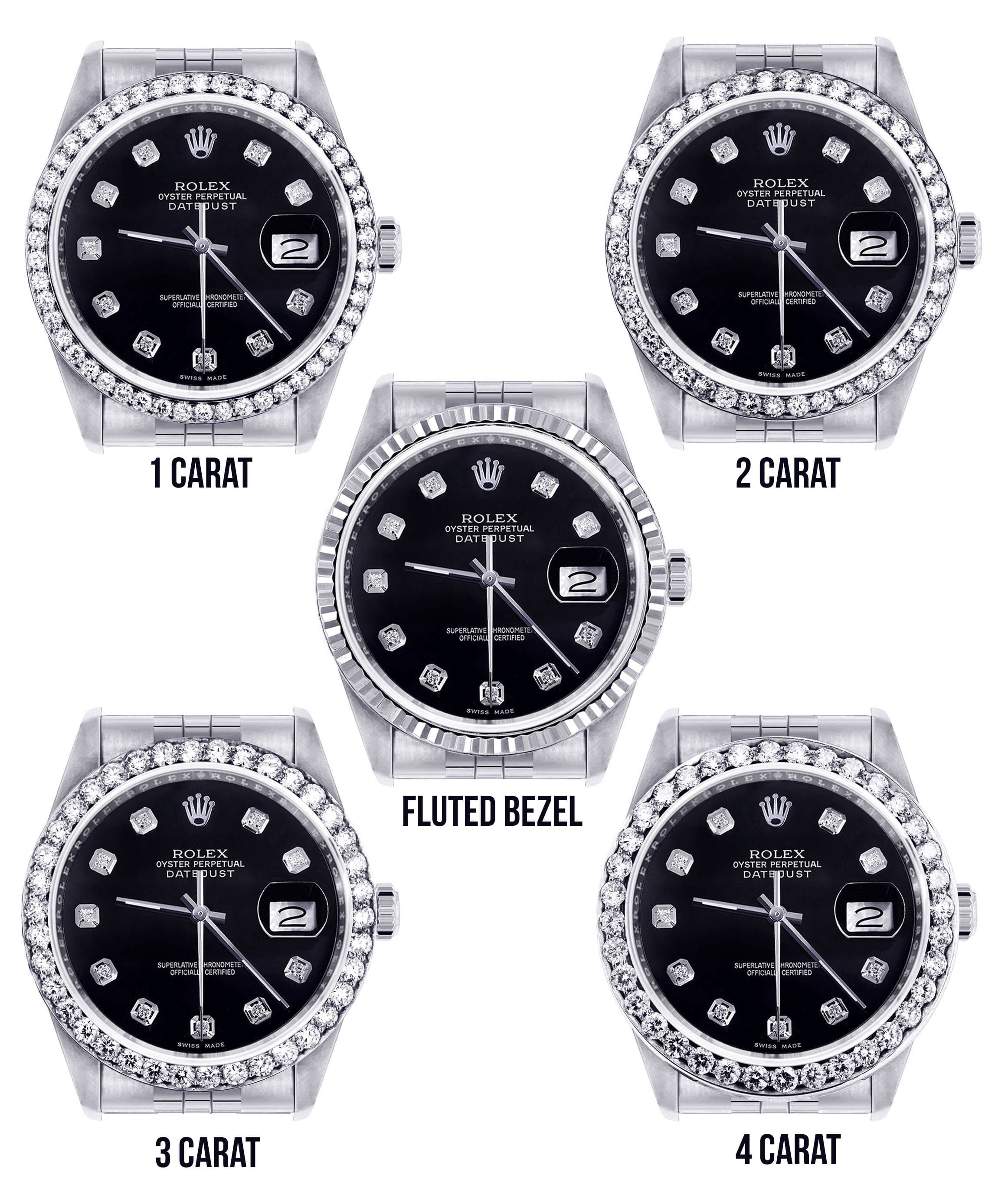 Rolex Datejust 36MM with a Jubilee Band. You can customize the bezel type between Gold Fluted Bezel or Diamond Bezel ranging from 1.00-4.00 carat. Below are more details of the watch.