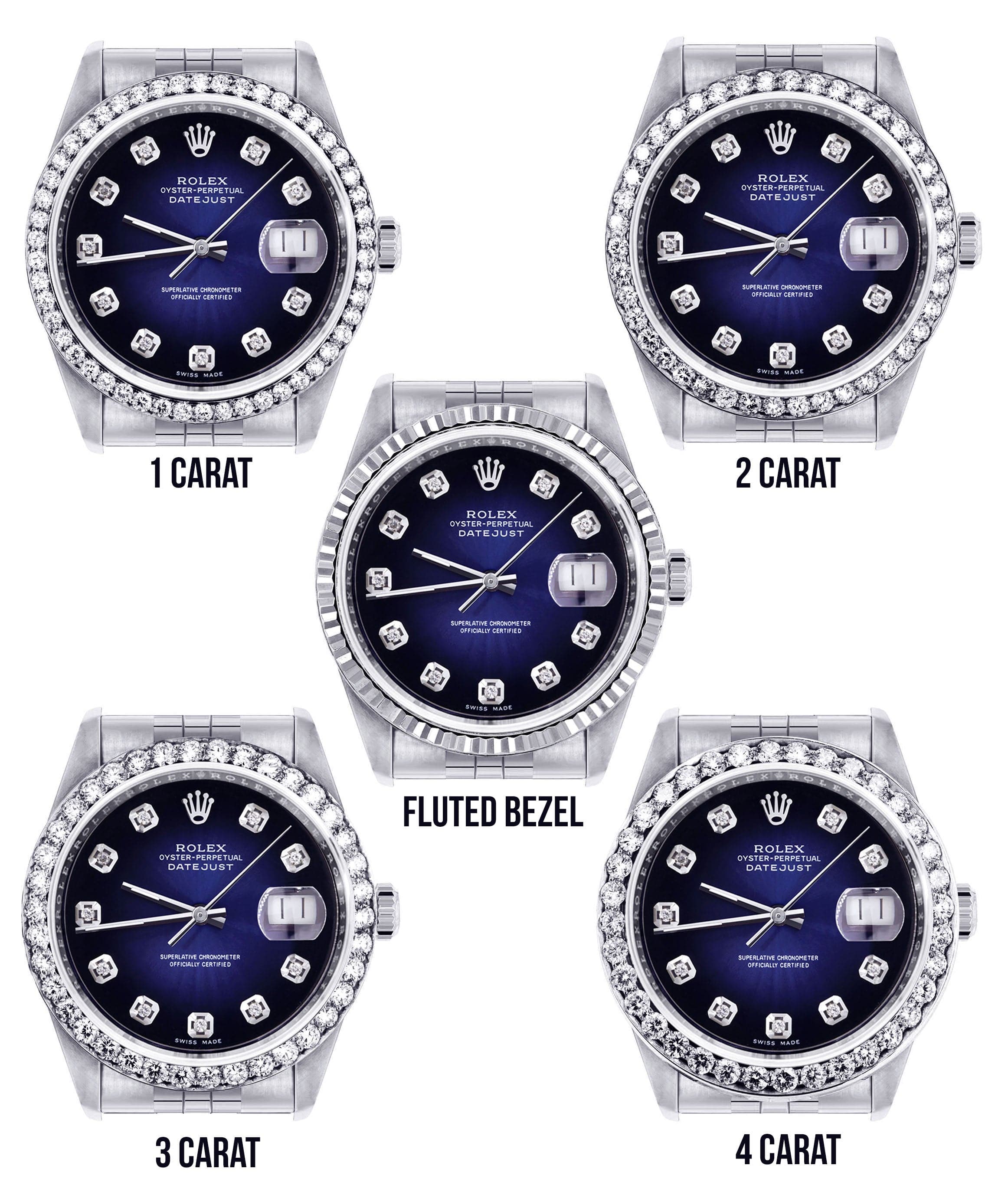 Rolex Datejust 36MM with a Jubilee Band. You can customize the bezel type between Gold Fluted Bezel or Diamond Bezel ranging from 1.00-4.00 carat. Below are more details of the watch.