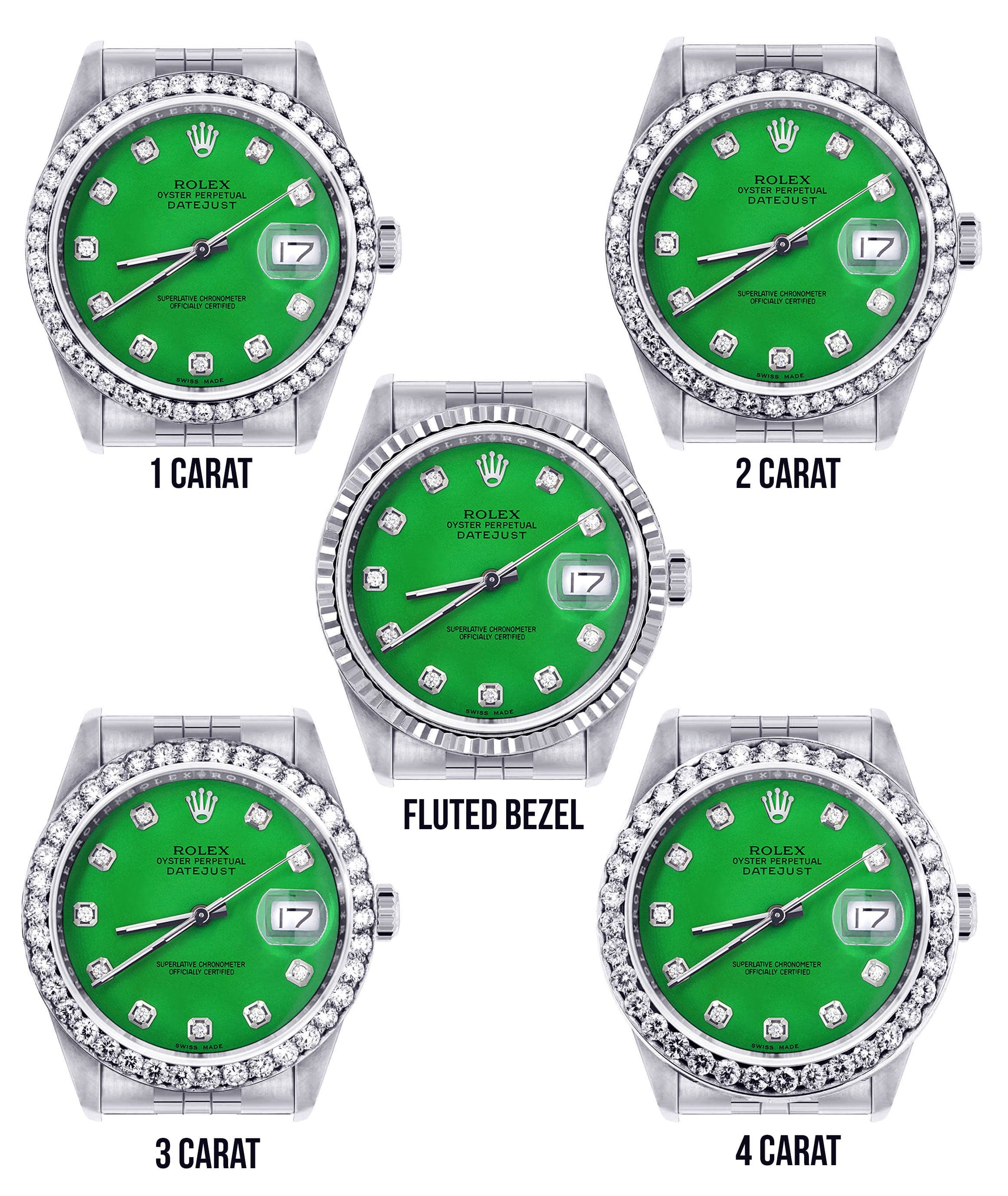 Rolex Datejust 36MM with a Jubilee Band. You can customize the bezel type between Gold Fluted Bezel or Diamond Bezel ranging from 1.00-4.00 carat. Below are more details of the watch.